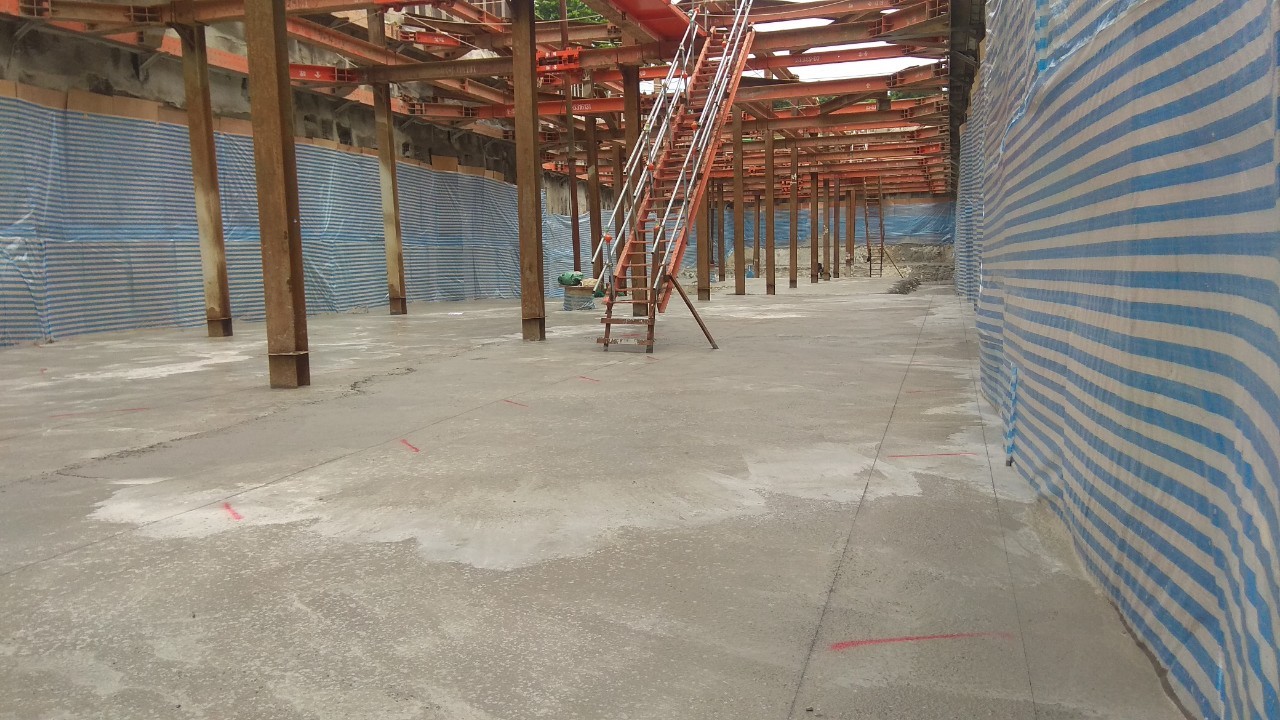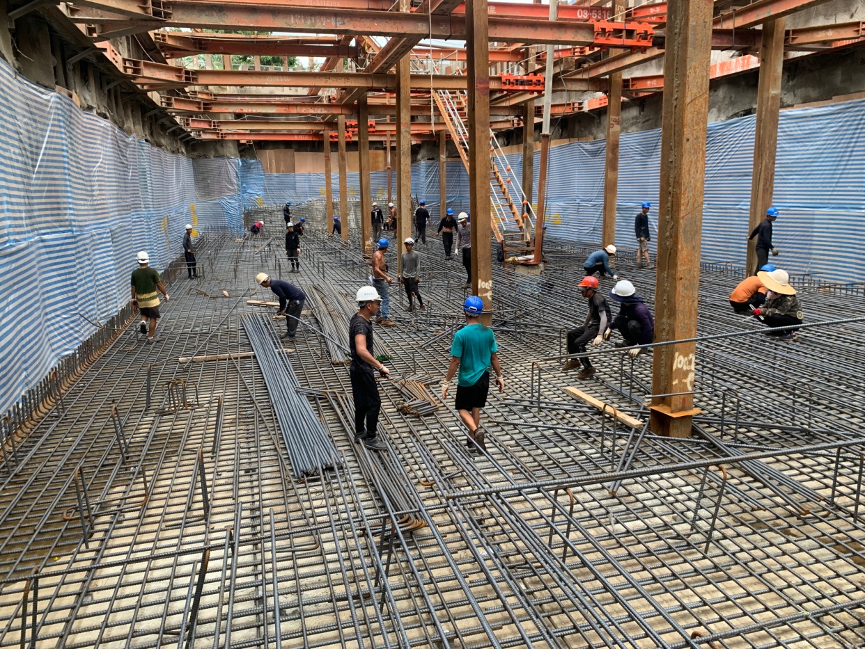 澆置完第一層PC,接著放樣及進行大底綁紮: